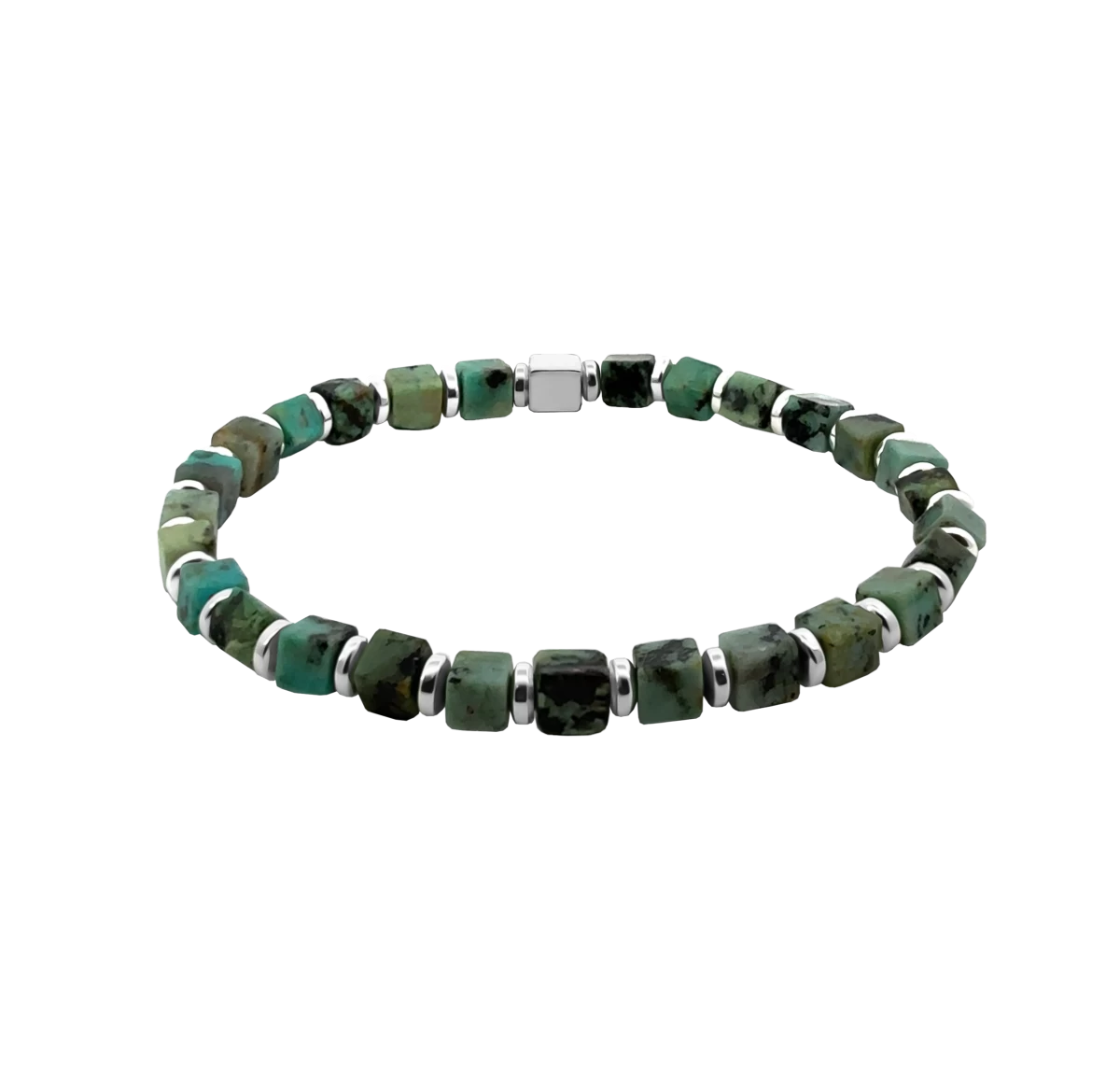 Pánský náramek z kostiček afrického tyrkysu s hematitem a výraznou kostkou ze stříbra 925 podporuje vnitřní klid, rovnováhu, sebedůvěru i každodenní odvahu.
