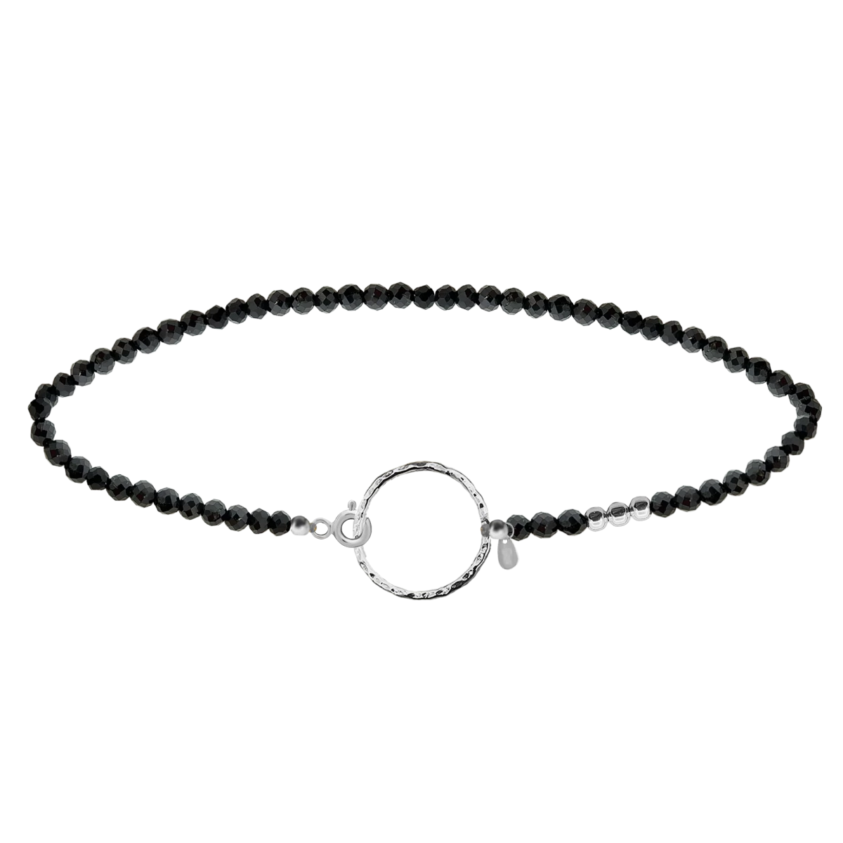 Nech se okouzlit přirozenou krásou a hlubokým, tajemným leskem spinelu s tímto speciálním náramkem, který kombinuje elegantní, jemně zdobený povrch kruhového přívěsku a tři lesklé stříbrné korálky. Tento jedinečný deisgn z něj činí ideální volbu pro ty, co milují jemné, ale silné doplňky.