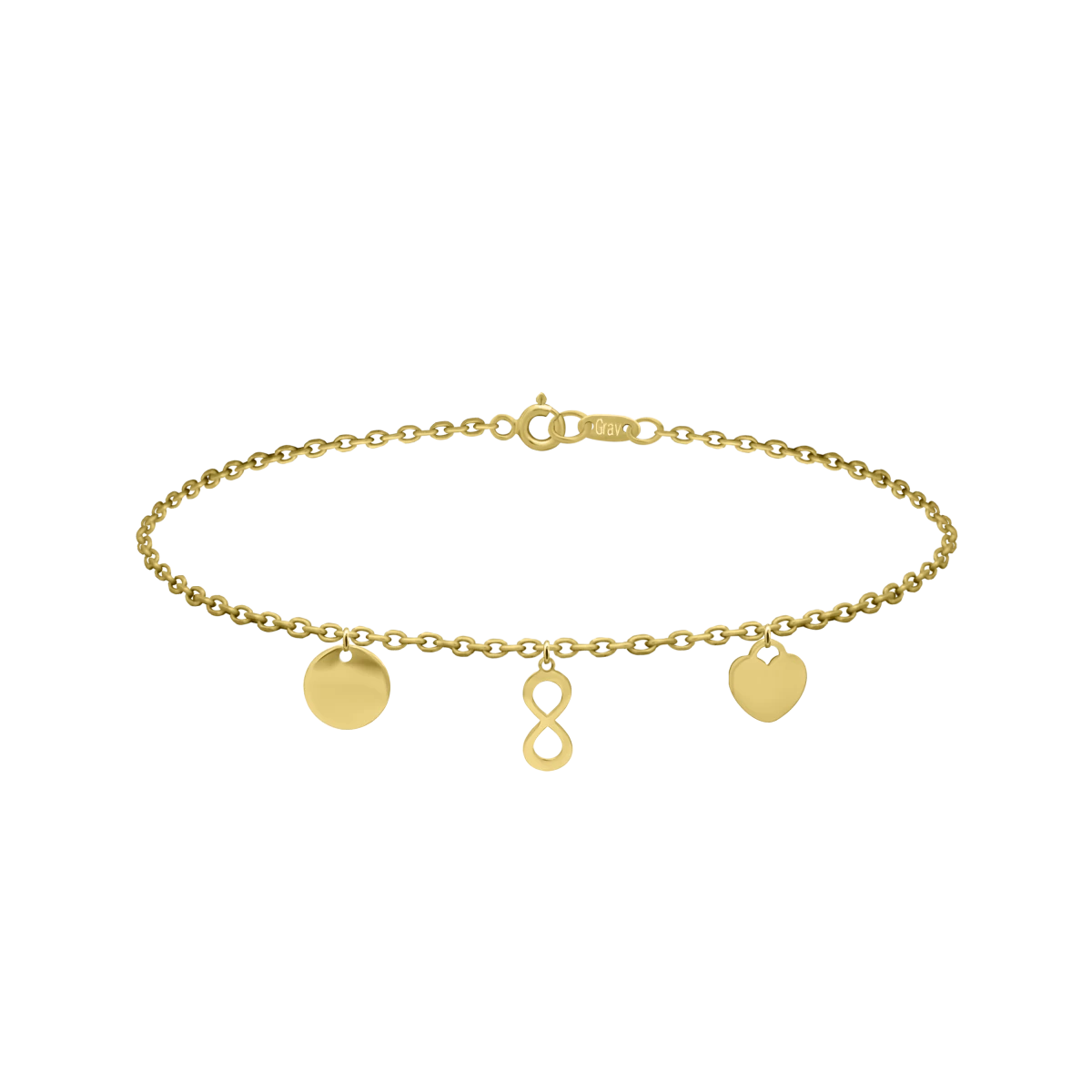 Dámský náramek ze žlutého zlata 585 visací kroužek nekonečno a srdce