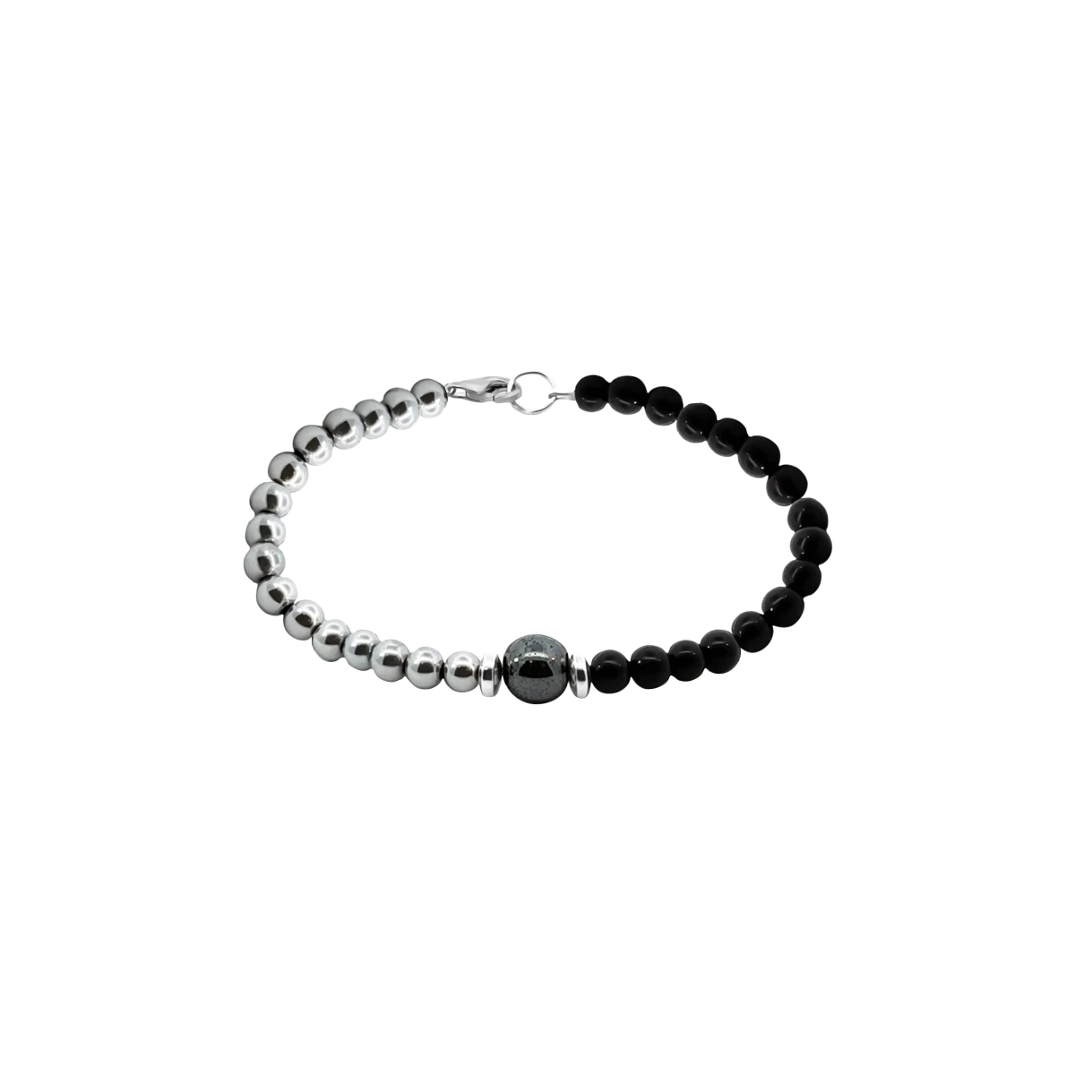 Pánský náramek z hematitu v barvě stříbra a černého onyxu. Elegantní volba pro každý den i slavnost. Hematit pro klid a soustředění, onyx pro ochranu.