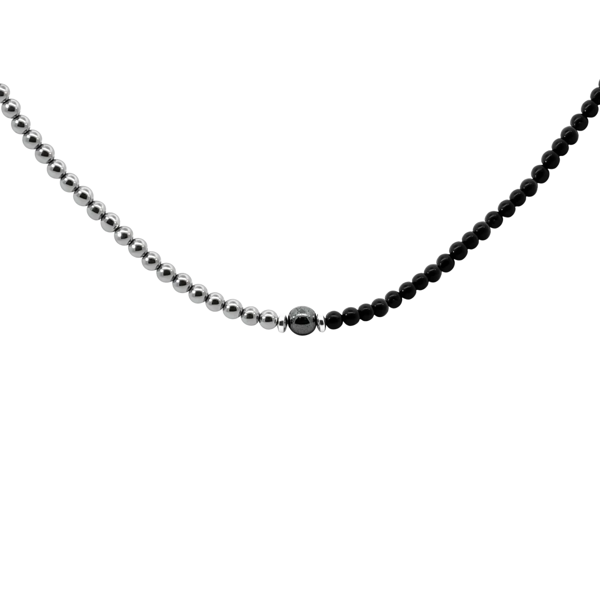 Elegantní pánský náhrdelník se stříbřitým hematitem a černým onyxem. Moderní doplněk na každý den i slavnost, symbol rovnováhy a ochrany.