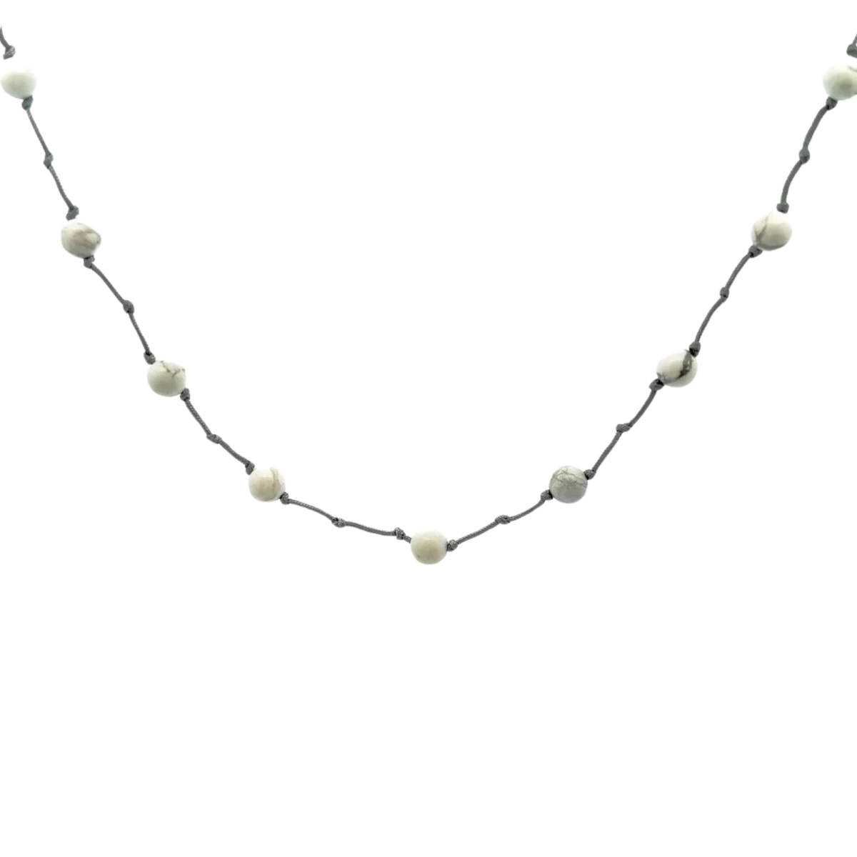 Ručně vázaný náhrdelník navlečený na barevné nerozbitné niti s kuličkami z howlitu (magnezitu) a stříbrným zapínáním. Barvu niti lze změnit podle přání. Uveď zvolenou barvu v komentáři!