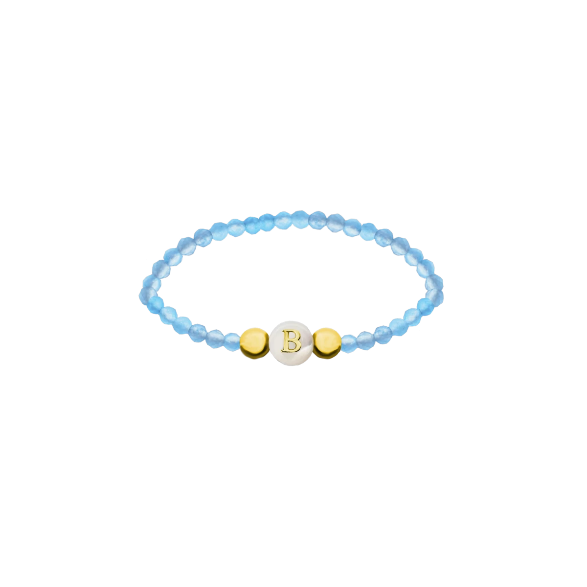 Dětský náramek s písmenem, modrým krystalem a zlatými korálky