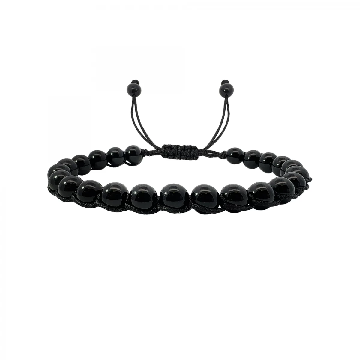Korálkový náramek z černého onyxu navlečený technikou macramé. Průměr korálků: 6 mm.