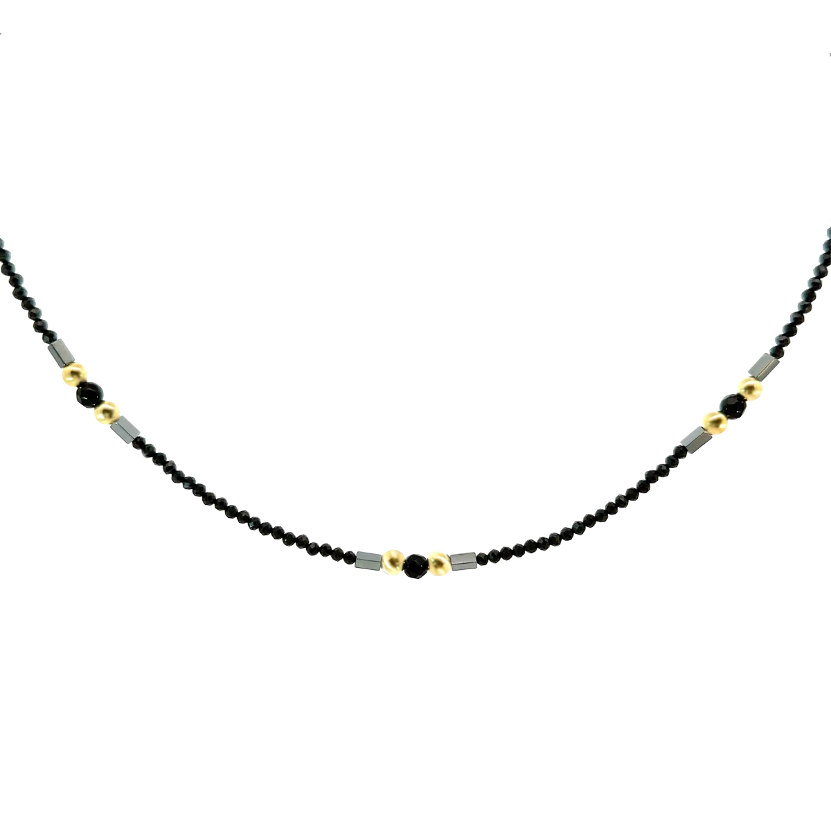 Unikátní ručně vyrobený náhrdelník s černým spinel, fasetovaným černým onyxem, hematitem a pozlacenými kuličkami z ryzího stříbra 925. Opravdu elegantní černá krása, dokonalý doplněk tvého neformálního vzhledu.