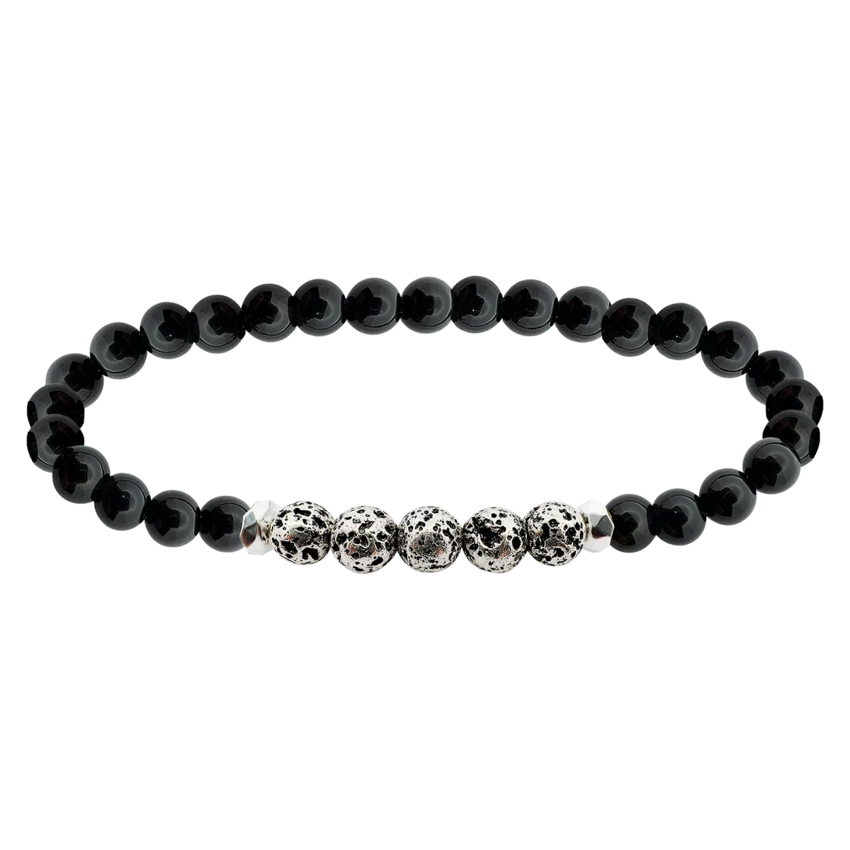 Tento náramek navržený pro muže muži je zdobený minerály z onyxu a lávového kamene a doplňky ze stříbra 925. Náramek nejenže slouží stylovému vzhledu, ale je také ideální pro vyjádření odvahy a síly, jelikož jsou tyto kameny tradičně symboly moci a vytrvalosti.