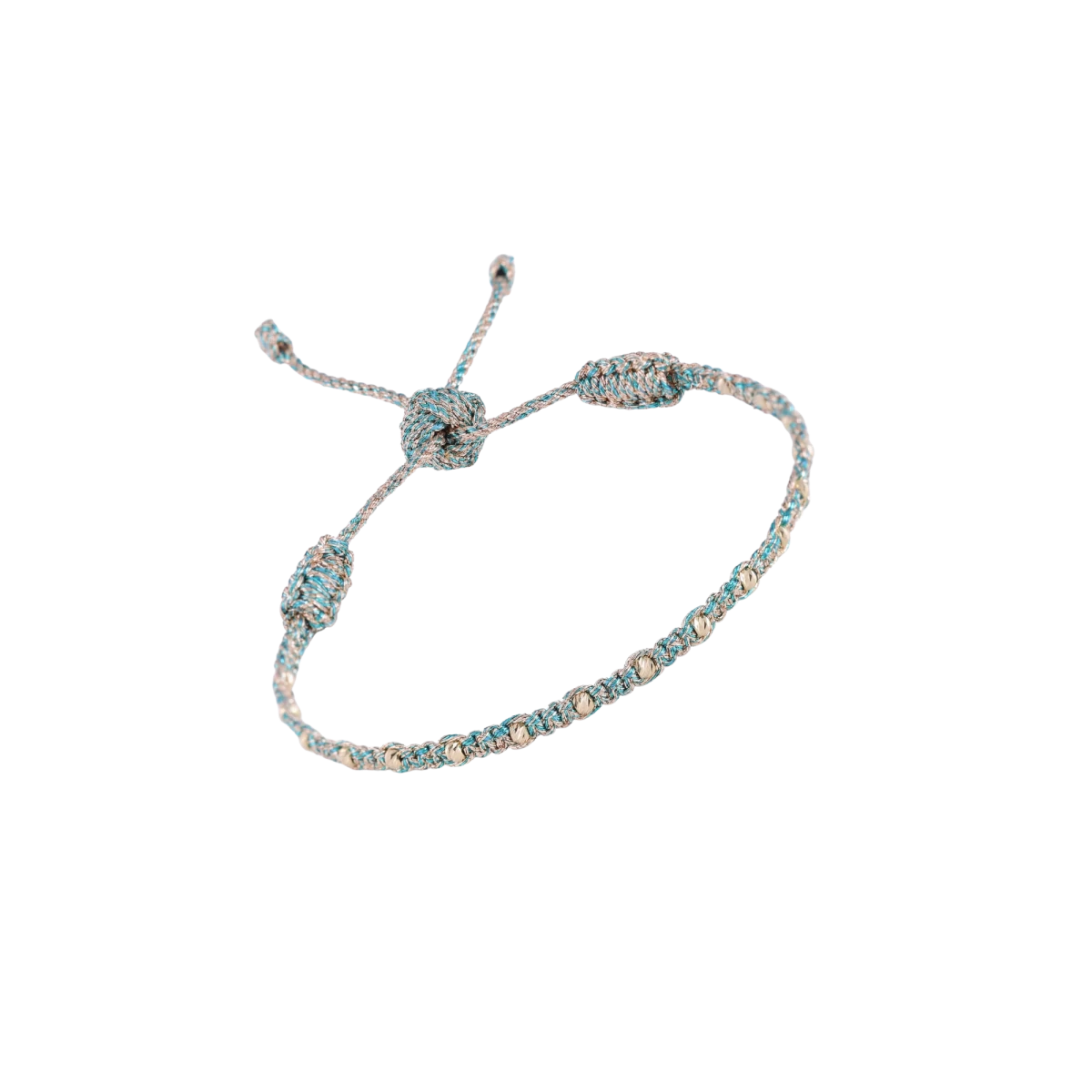 ZILIA Maya Luna: ručně tkaný náramek z broskvových a modrých nití s 18k pozlacenými korálky. Středomořský nádech a barevný akcent pro lehkou letní eleganci.
