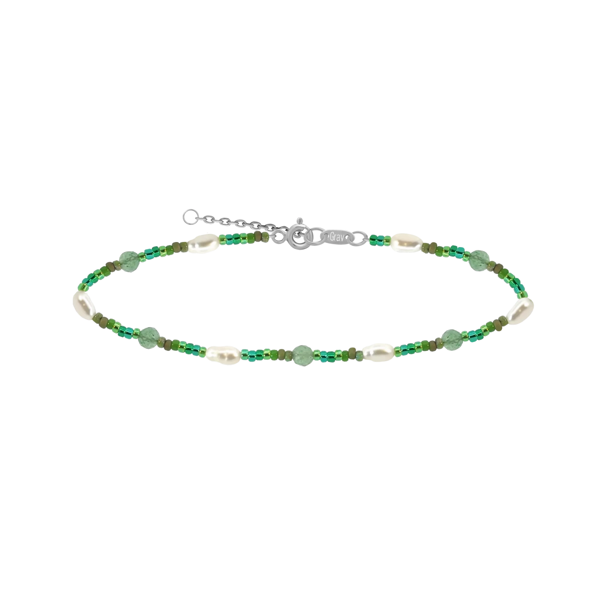 Tento náramek vyzařuje slavnostní třpyt díky dominantním zeleným designovým korálkům a třpytivému zelenému avanturínu, které vytvářejí svěží, a přitom vytříbený vzhled. Mnozí považují avanturín za kámen harmonie, štěstí a pozitivní energie, což dodává tomuto jedinečnému šperku zvláštní význam. Jemné bílé perly ve tvaru rýže tvoří krásný kontrast se zelenými tóny a dodávají náramku ještě větší eleganci. Díky prodlužovacímu řetízku lze velikost snadno upravit, takže je ideální volbou, pokud chcete nosit slavnostní náladu a přírodní eleganci.