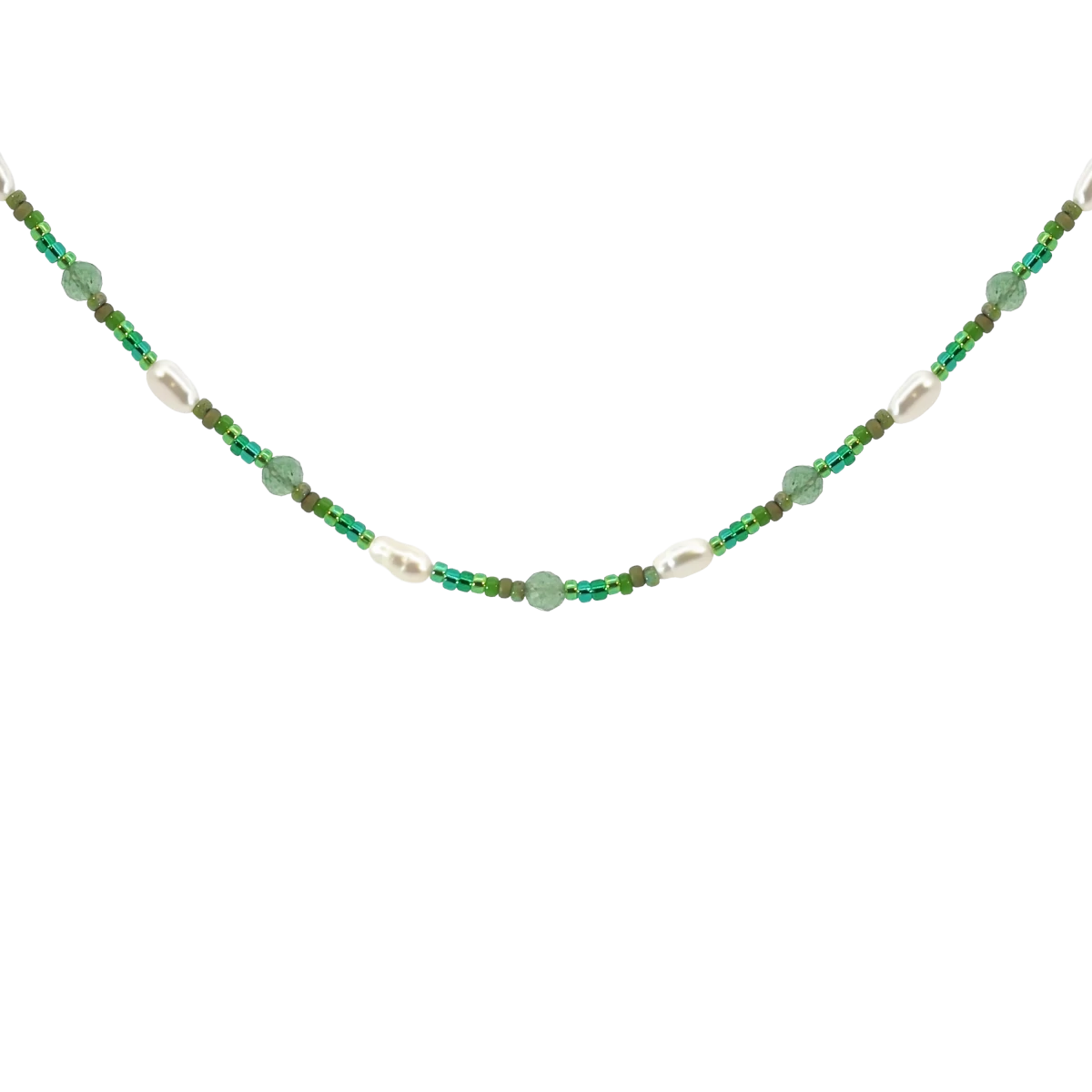 Náhrdelník ZILIA s jemnými zelenými korálky a přírodním aventurínem působí svěže i noblesně. Kámen štěstí a harmonie doplňují drobné bílé perly, které zvýrazní slavnostní charakter šperku.