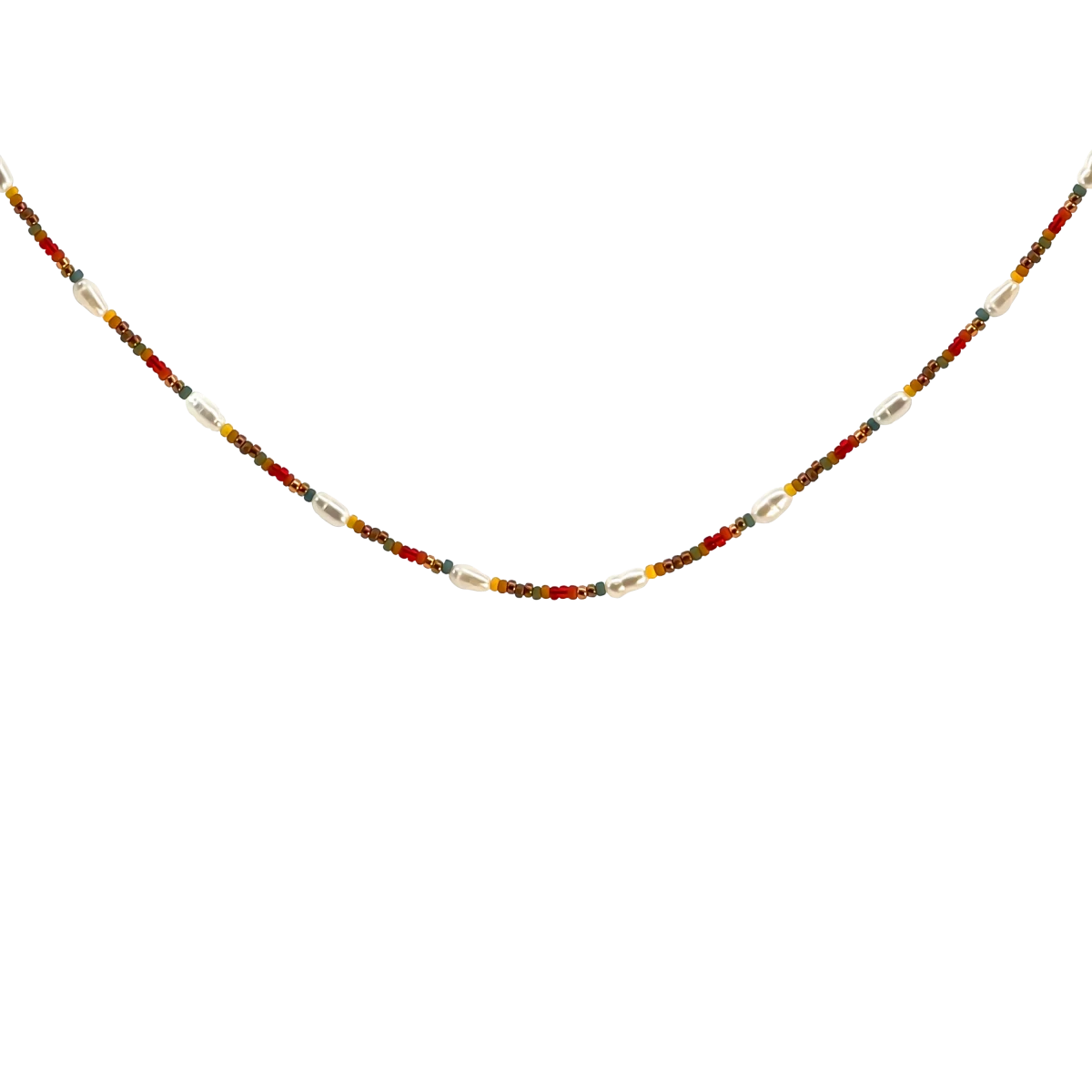 Podzimní náhrdelník ZILIA v tónech zlatavé hnědé žluté a červené spojuje drobné korálky a bílé říční perly s nastavitelným prodloužením pro dokonalé pohodlí.