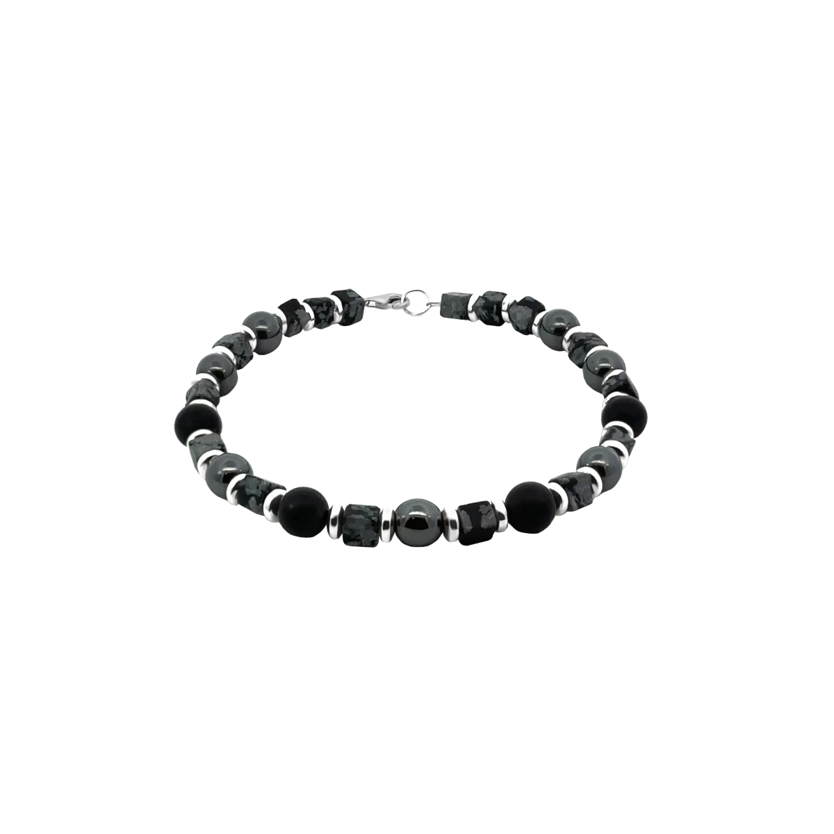 ZILIA pánský náramek ze sněhového obsidiánu, hematitu a černého onyxu se stříbřitými akcenty vyzařuje moderní mužnost a čistý styl. Vhodný na každý den i na výjimečné příležitosti. Sněhový obsidián podporuje očistu a emoční rovnováhu, hematit uzemnění a sebejistotu, černý onyx ochranu a vytrvalost. Elegantní volba pro muže, kteří chtějí sílu přírody v nadčasovém šperku.