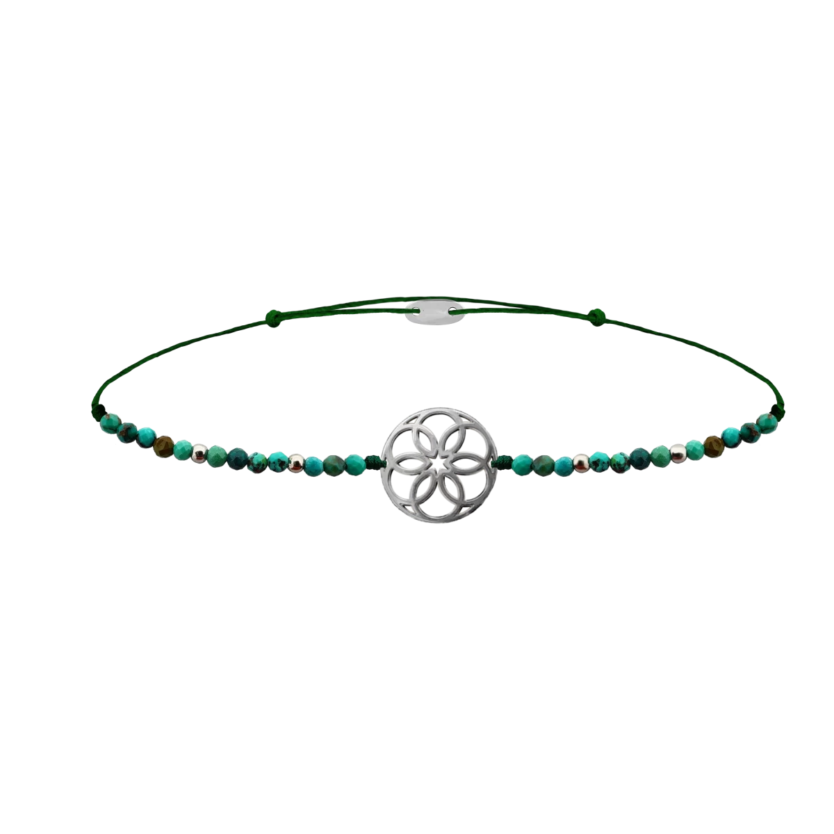 Užijte si uklidňující účinek symbolu mandaly a ochranné energie tyrkysu v tomto elegantním náramku, který je výjimečný díky lesku stříbrných korálků a je ideálním doplňkem ke každému outfitu. Průměr přívěsku je 13 mm.