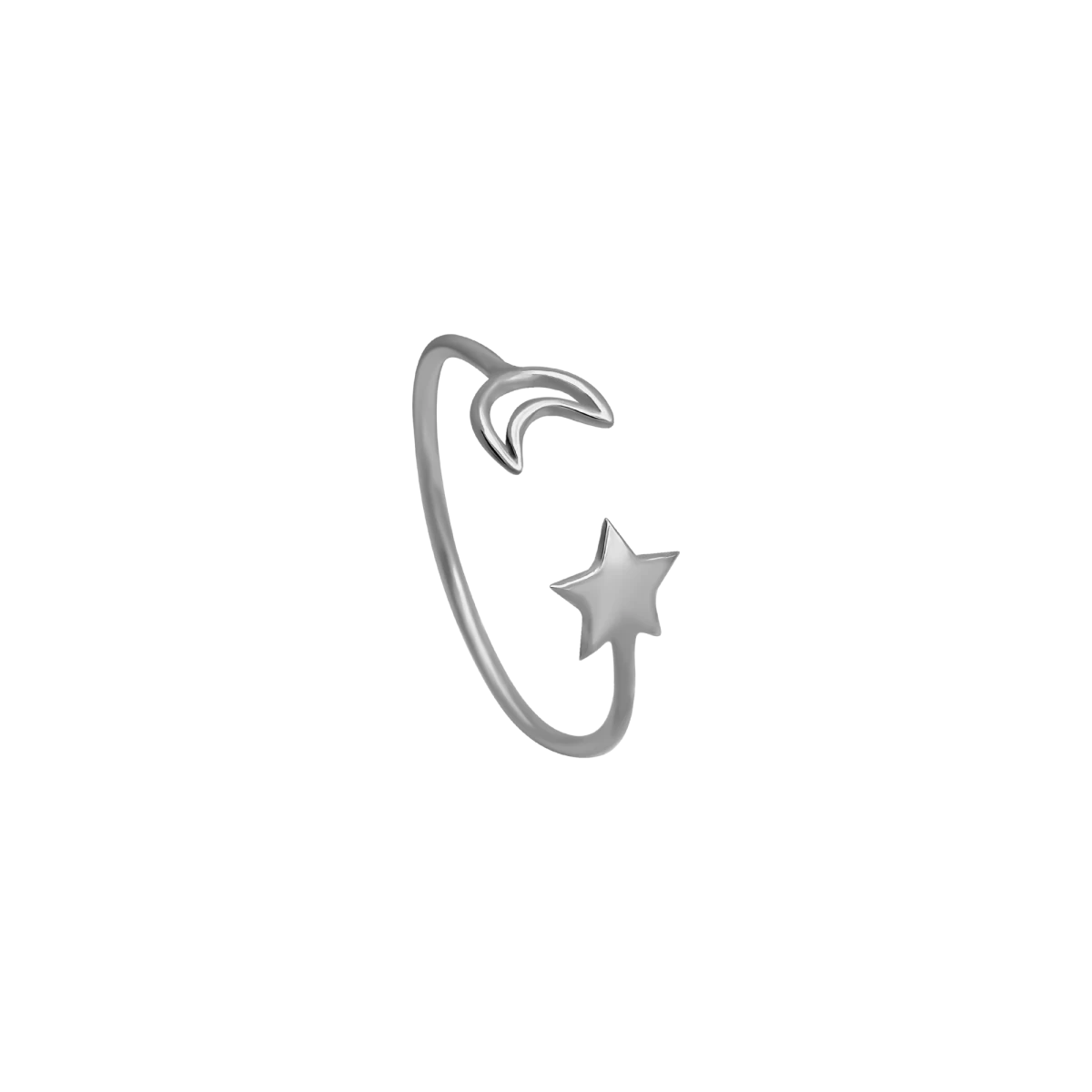 Okouzlující otevřený prsten inspirovaný noční oblohou zaujme motivem měsíce a hvězdy na koncích. Precizní ruční zpracování podtrhuje originalitu tohoto šperku, který skvěle doplní váš styl při každé příležitosti. Objevte jedinečný kousek, který rozzáří vaši šperkovnici.