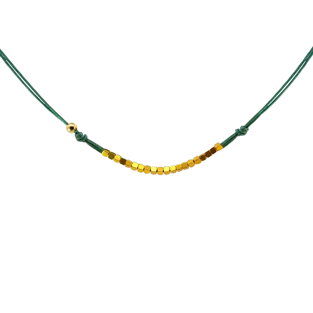Zvýrazněte outfit zeleným pleteným náhrdelníkem s hematitovými kostičkami ve zlatém odstínu. Nastavitelný řetízek zajistí pohodlné nošení a zářivý efekt.