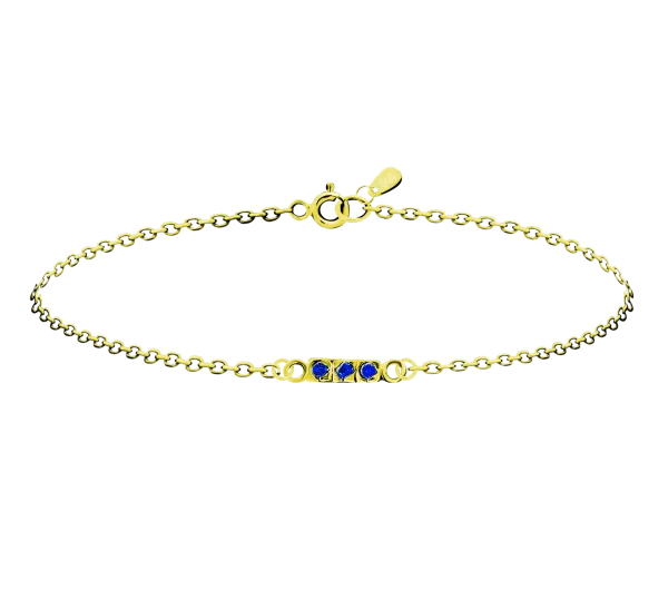 Náš náramek s modrými zirkony ze žlutého zlata vyniká nadčasovou elegancí, tři kameny prosvětlují zápěstí při každé příležitosti. Jemný ručně vyrobený šperk podtrhne tvůj styl v každodenním i večerním outfitu. Velikost kamenů je 1 mm až 2,5 mm
